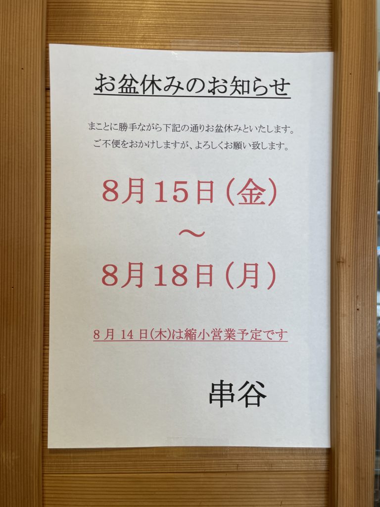 2025年8月5日 / 最終更新日 : 2025年8月5日 kushitani お知らせ 2025年お盆休みのお知らせ お盆休み、下記の通りとなります。 ご不便をおかけし申し訳ありませんがよろしくお願いします。 尚、14日は商品少なめの縮小営業の予定です。 共有:Facebookいいね:いいね 読み込み中…