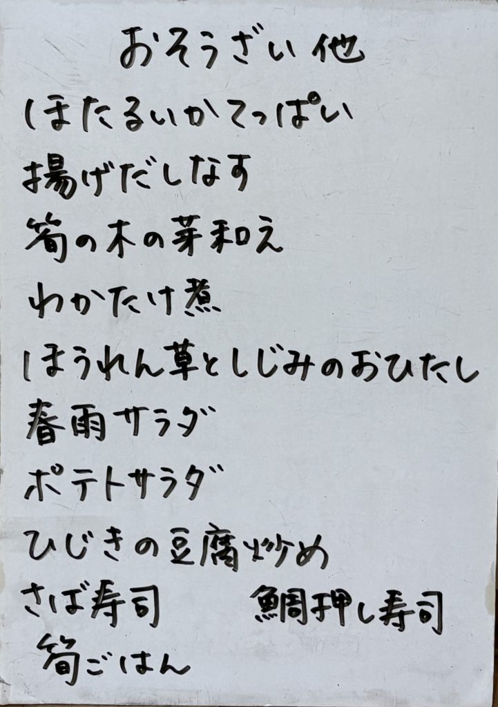 2026年4月14日 / 最終更新日 : 2026年4月14日 kushitani 今日のおすすめ 4月14日(火)のメニュー 今日も旬の筍を使って、木の芽和えやわかたけ煮、筍ごはんなど作ります。 さば寿司、一人前パックも作りますのでよろしくお願いします! 共有:Facebookいいね:いいね 読み込み中…