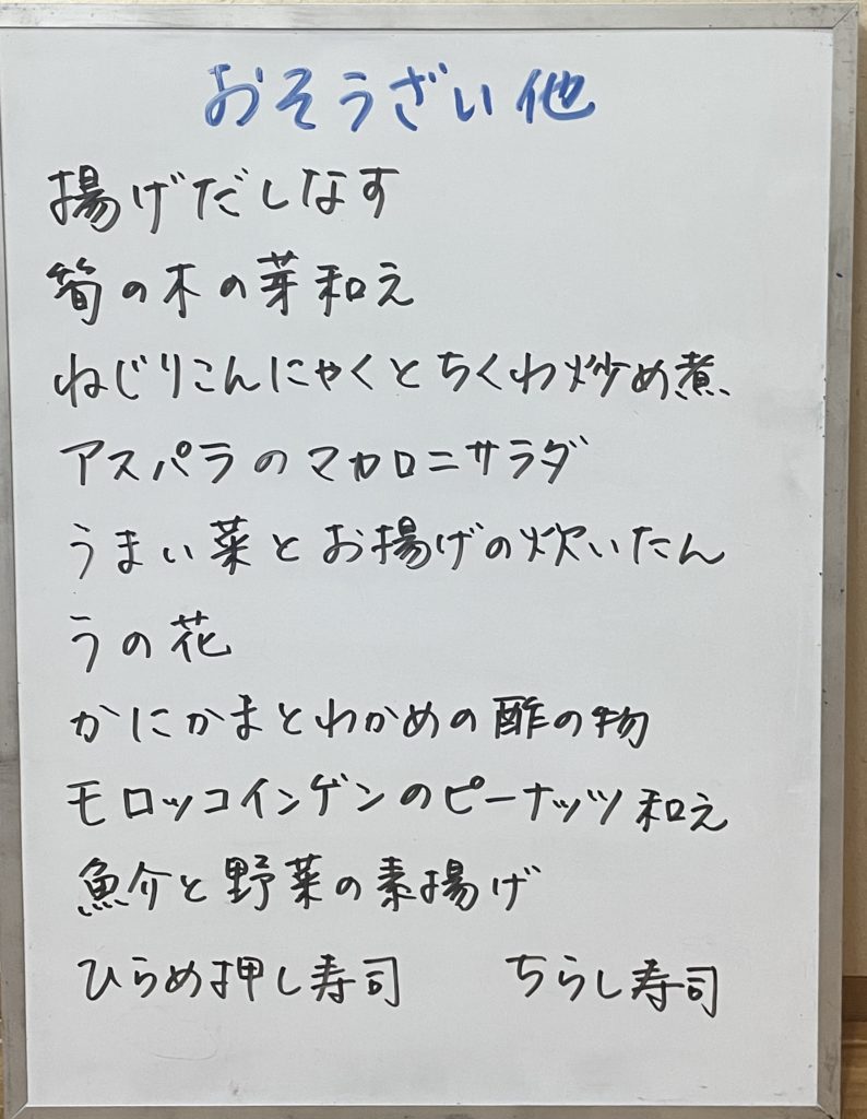2025年5月15日 / 最終更新日 : 2025年5月15日 kushitani 今日のおすすめ 5月15日(木)のメニュー あらいぶきっちんのお豆腐、お揚げの入荷日です。今日からお待ちかねの青大豆おぼろもあります! 紅ずわいかに、あじバーグもありますのでよろしくお願いします。 共有:Facebookいいね:いいね 読み込み中…