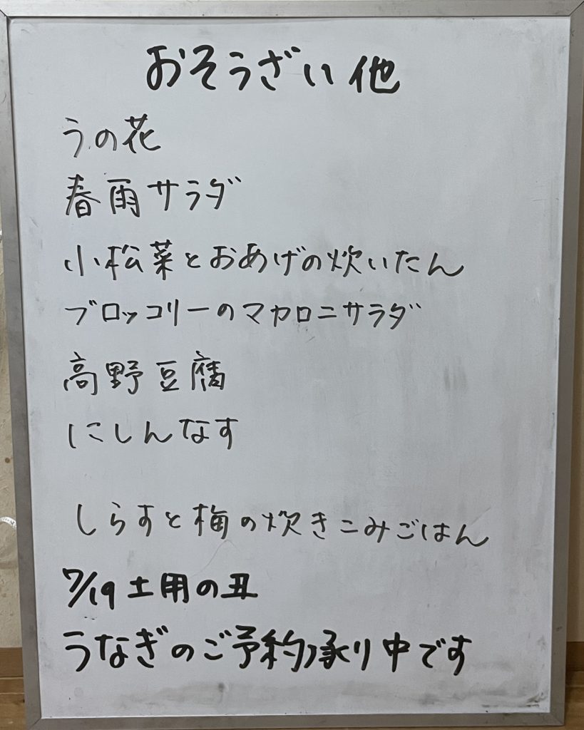 2025年7月10日 / 最終更新日 : 2025年7月10日 kushitani 今日のおすすめ 7月10日(木)のメニュー 今日はあらいぶきっちんのお豆腐、お揚げの入荷日です! 土用の丑のうなぎのご注文も承り中です。よろしくお願いします。 共有:Facebookいいね:いいね 読み込み中…