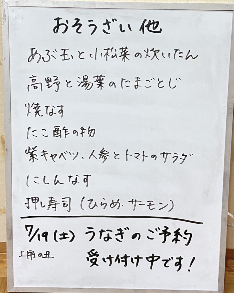 2025年7月5日 / 最終更新日 : 2025年7月5日 kushitani 今日のおすすめ 7月5日(土)のメニュー 今日は久しぶりににしんなすを炊く予定です! はもの子煮も美味しいですよ。 共有:Facebookいいね:いいね 読み込み中…